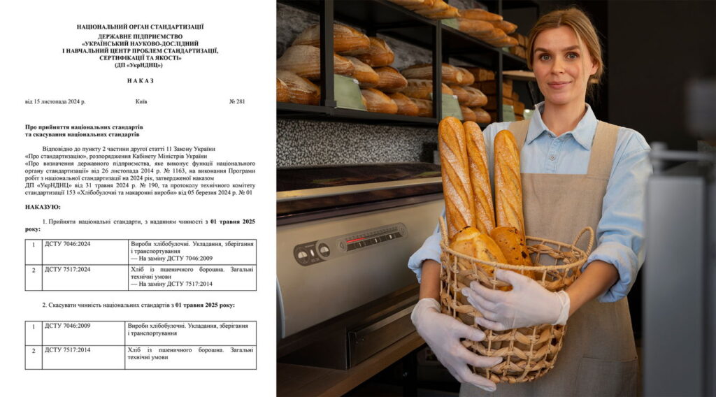ДСТУ 7046:2024 «Вироби хлібобулочні. Укладання, зберігання і транспортування» (на заміну ДСТУ 7046:2009) та ДСТУ 7517:2024 «Хліб із пшеничного борошна. Загальні технічні умови» (на заміну ДСТУ 7517:2014) відповідно до наказу ДП «УкрНДНЦ» від 15.11.2024 № 281.