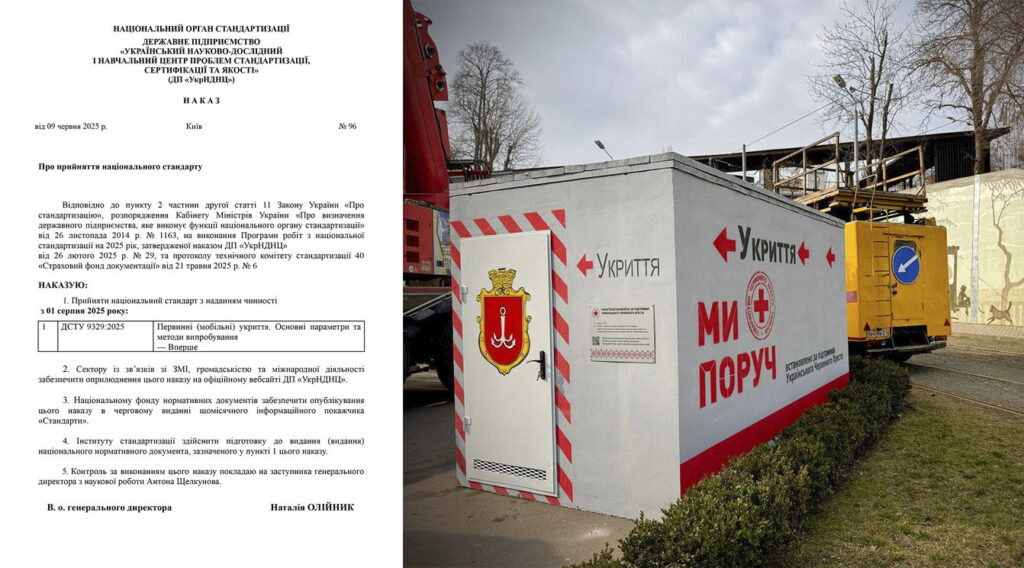 Наказом державного підприємства «Український науково-дослідний i навчальний центр проблем стандартизації, сертифікації та якості» від 9 червня 2025 року № 96 прийнято національний стандарт ДСТУ 9329:2025 «Первинні (мобільні) укриття. Основні параметри та методи випробування».